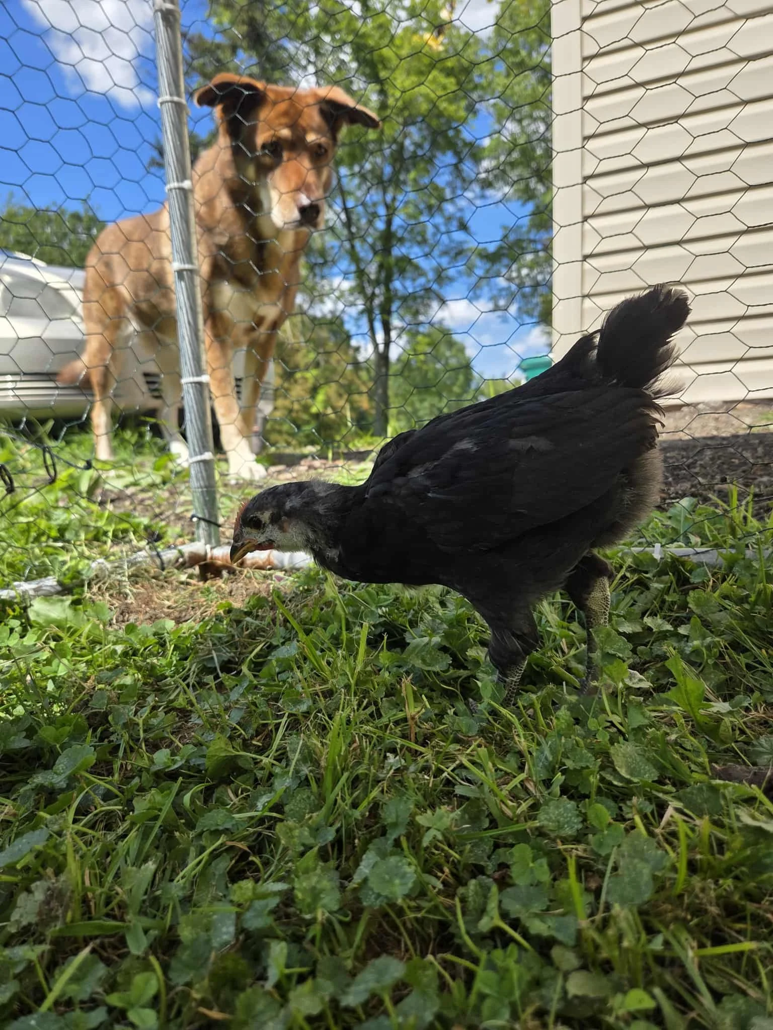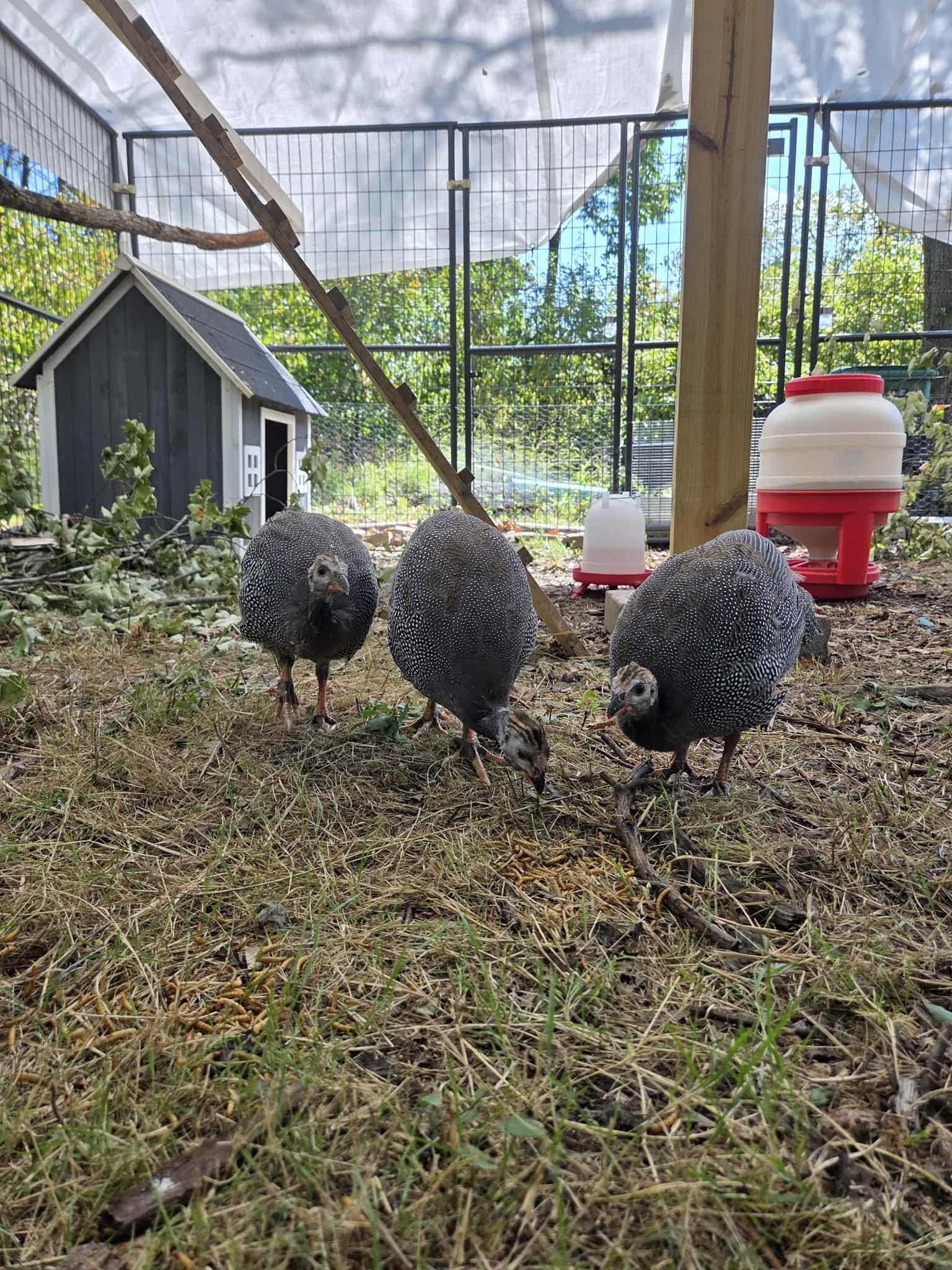 We rescued three pearl guinea fowl from a sanctuary member’s property, giving them a safe home here after their flock was threatened by foxes, coyotes, and other predators.